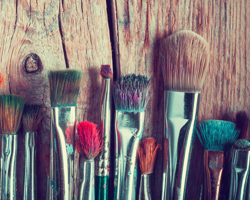 An implement with a handle, consisting of bristles, hair, or filaments set into a socket, used for applying a liquid or powder to a surface.