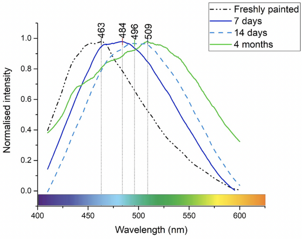 Figure 2: This graph shows how the fluorescence spectrum of aged linseed oil changes after exposure to UV light for 24 hours and subsequent storage in darkness. The x-axis represents the emission wavelength, while the y-axis shows the fluorescence intensity. Initially, the oil fluoresces at a shorter wavelength (blue light), but as the oil ages and yellows, the fluorescence shifts to a longer wavelength (green-yellow light). This shift, known as a bathochromic shift, indicates the chemical changes in the oil’s structure that occur during the aging and yellowing process. The excitation wavelength for all measurements was 360 nm. This evidence reinforces how light exposure and subsequent storage conditions influence the yellowing of linseed oil in paintings.