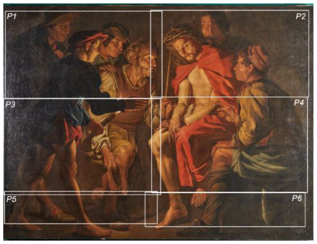 This is a visible light image of Matthias Stomer’s “Mocking of Christ” in the permanent collection of Museo Civico, Castello Ursino, in Catania, Italy. The rectangles and labels P1–P6 show the different areas scanned in the study.